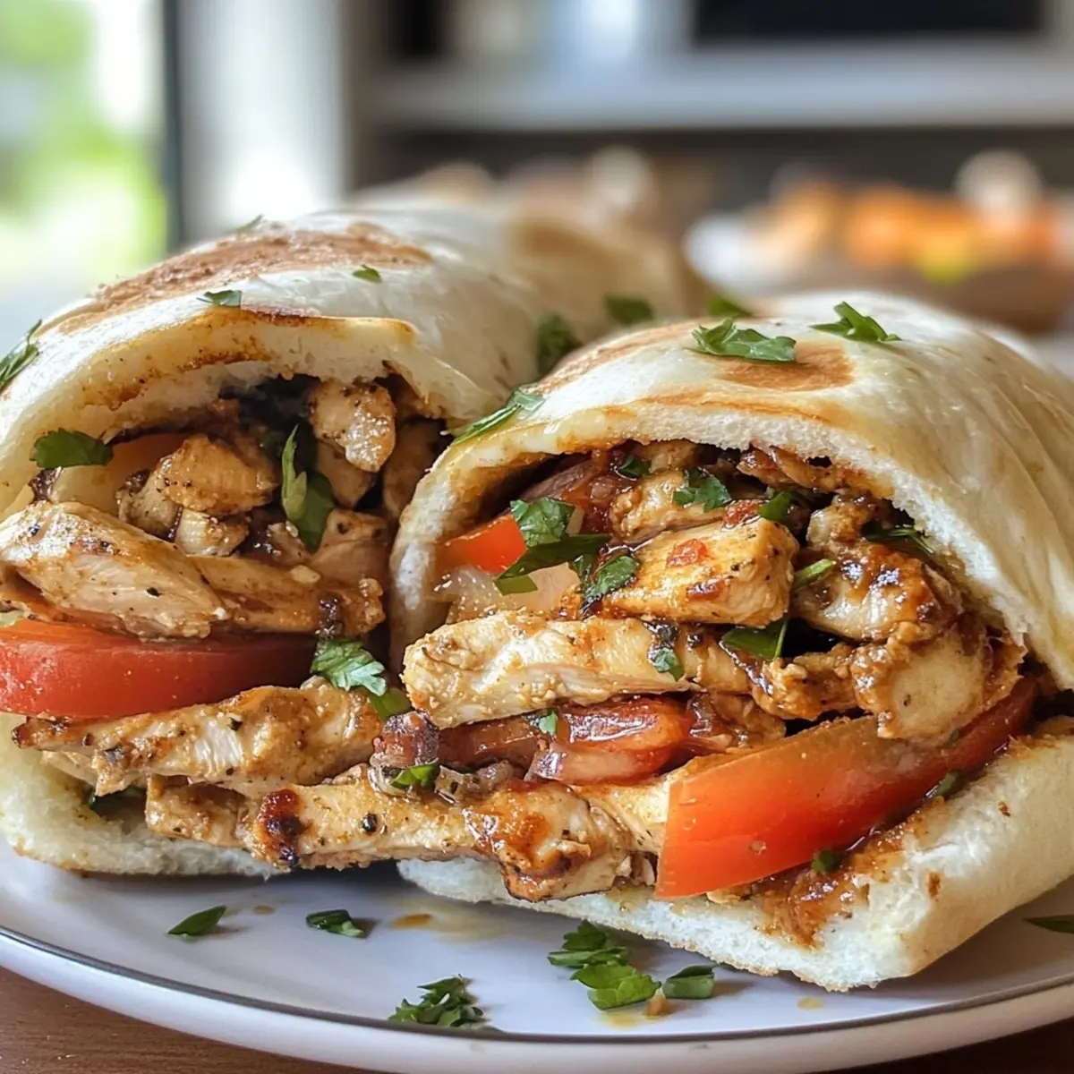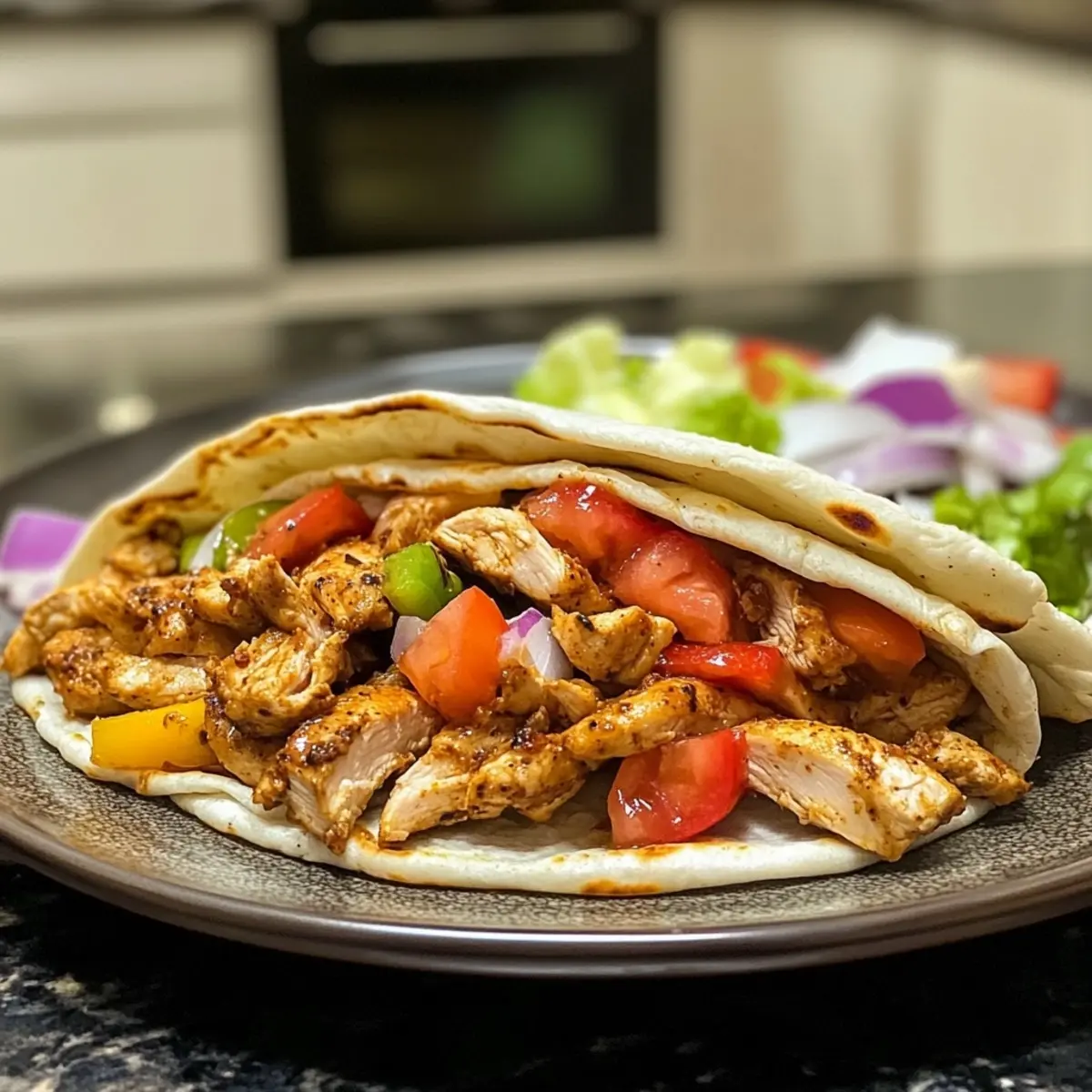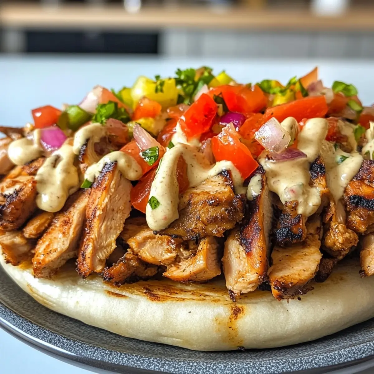 - Take your warm pita bread or wrappers and fill them with the sliced chicken, topped with a mix of fresh vegetables and a drizzle of tahini or garlic sauce.