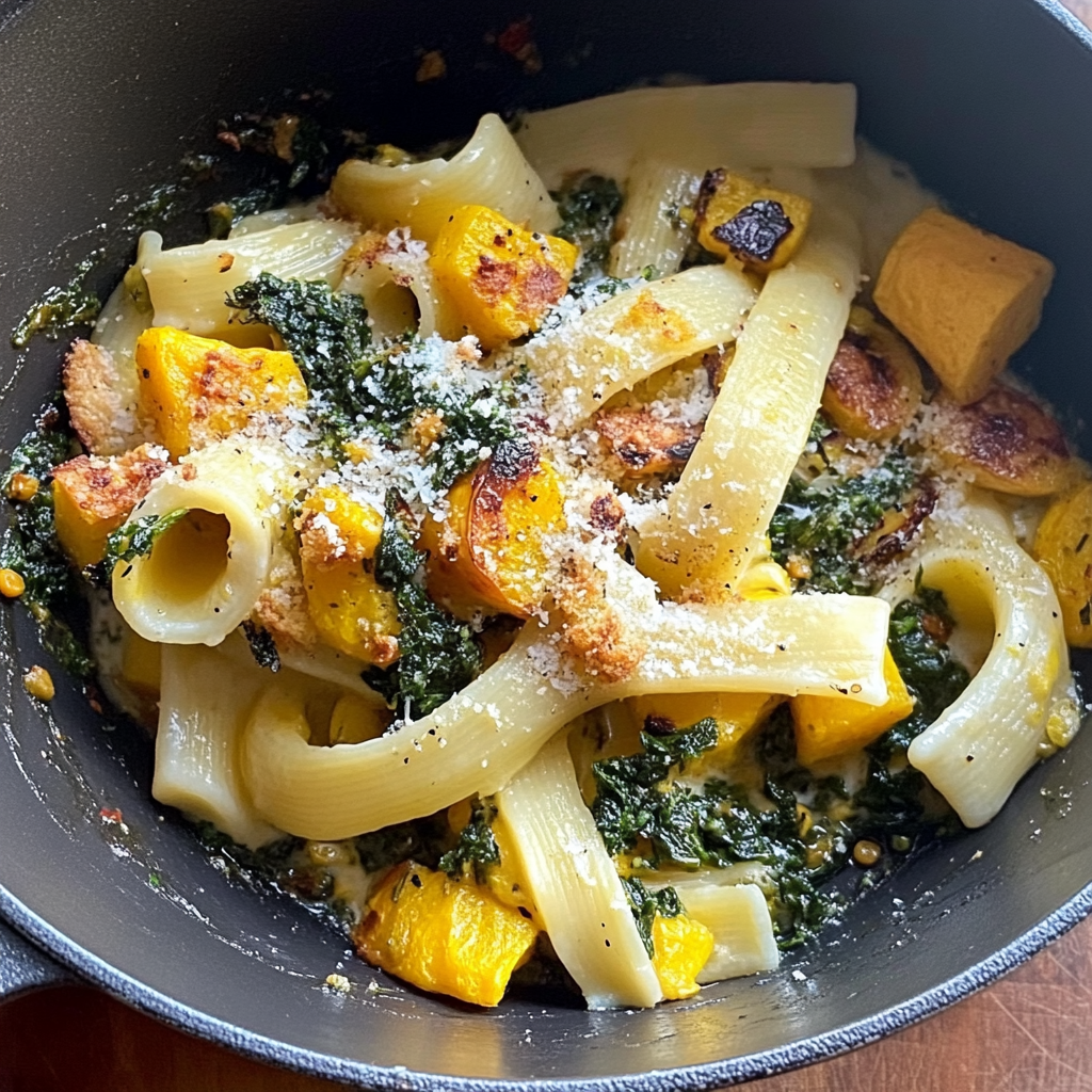 - 5. In a skillet over medium heat, add more olive oil if needed and sauté minced garlic until fragrant. Add roasted squash and reserved pasta water to create a sauce.