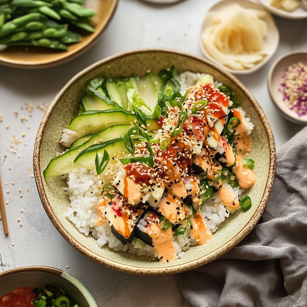 In summary, Deconstructed Sushi Bowls with Spicy Yuzu Mayo provide a delightful and customizable meal option that is easy to prepare at home. With fresh ingredients and a zesty sauce, these bowls are both satisfying and nutritious. Feel free to experiment with different toppings and proteins to make each bowl unique. Enjoy this vibrant dish as a quick lunch or dinner option that brings the flavors of sushi right to your table!