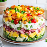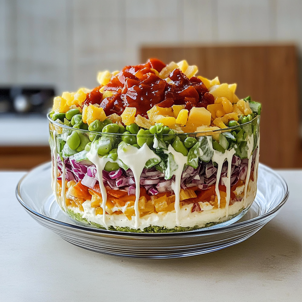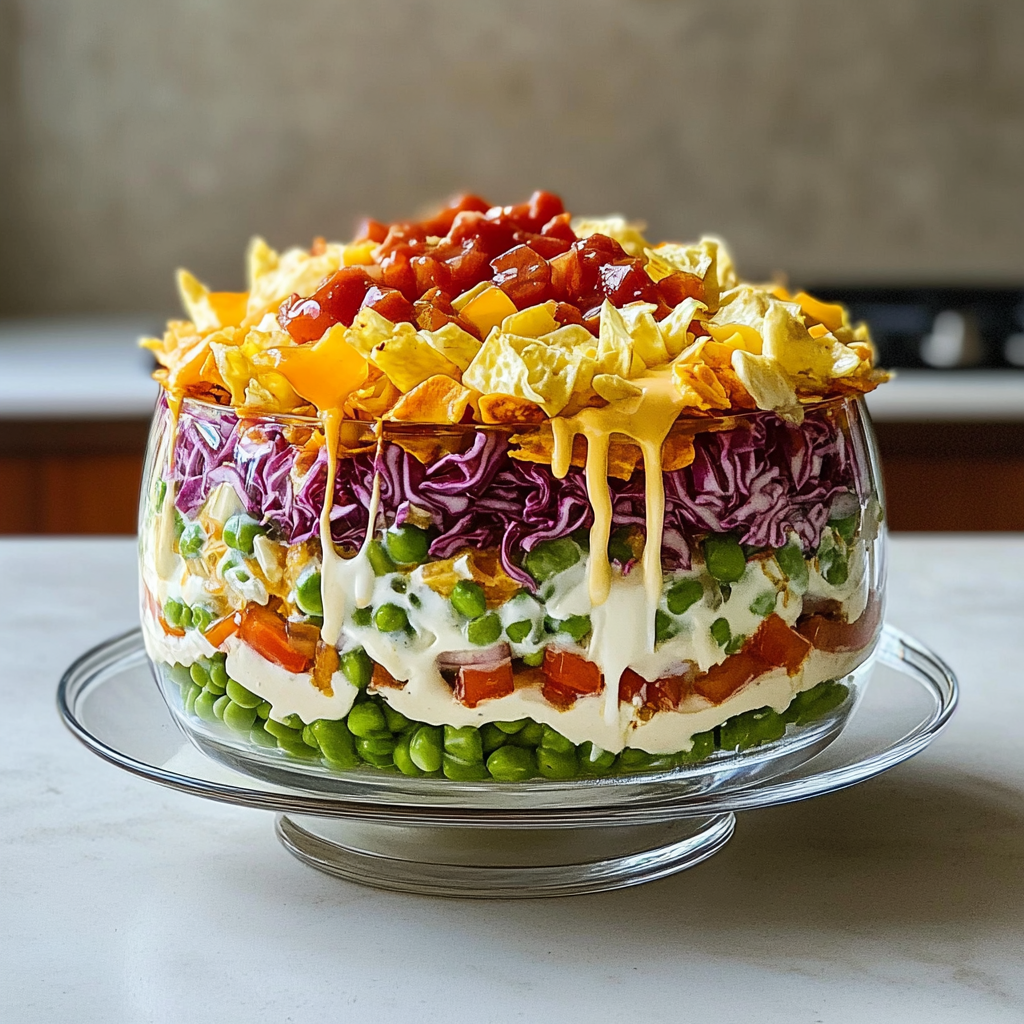 In summary, the 7 Layer Salad is a versatile dish perfect for any occasion. With its vibrant colors and layers of fresh ingredients, it not only looks appealing but also delivers fantastic flavors and textures in every bite. Preparing this salad ahead of time can save you effort during busy gatherings while still impressing your guests. Don’t hesitate to experiment with various ingredients and dressings to create your own unique version of this classic recipe! Enjoy your culinary journey with 7 Layer Salad!