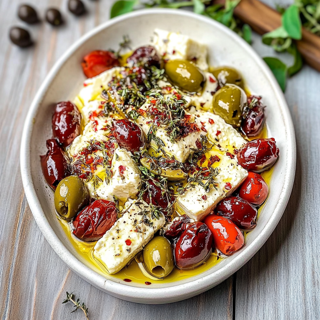 Start by preparing your marinade while preheating the oven. Place the feta in a baking dish, drizzle with olive oil, and add the olives. Bake until golden and bubbly, then serve immediately for maximum flavor and warmth.