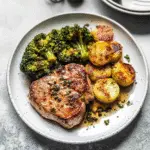 In those final moments of baking (around minute 25), sprinkle grated Parmesan cheese over both the pork chops and broccoli. Return them to the oven until melted and golden—trust me; it’s worth it!