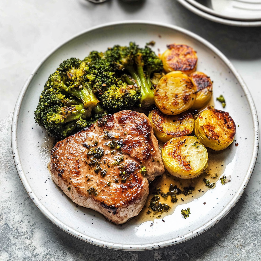 Start by preheating your oven to 400°F. Season the pork chops with garlic, parmesan, and spices. Sear them in a hot skillet briefly before transferring to a sheet pan alongside broccoli. Roast until everything is cooked perfectly, about 20-25 minutes.