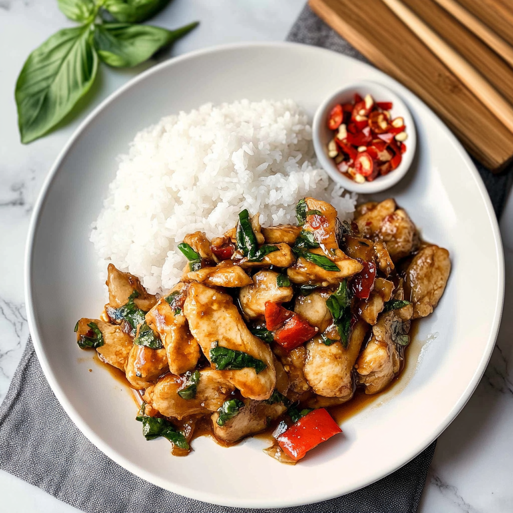 Experience the vibrant flavors of Thai Basil Chicken, a quick and easy stir-fry that brings the essence of Thailand to your table. Tender chicken thighs are sautéed with aromatic garlic, spicy chili, and fresh Thai basil, delivering a delightful balance of savory and sweet. Perfect for busy weeknights or casual gatherings, this dish promises satisfaction in every bite.