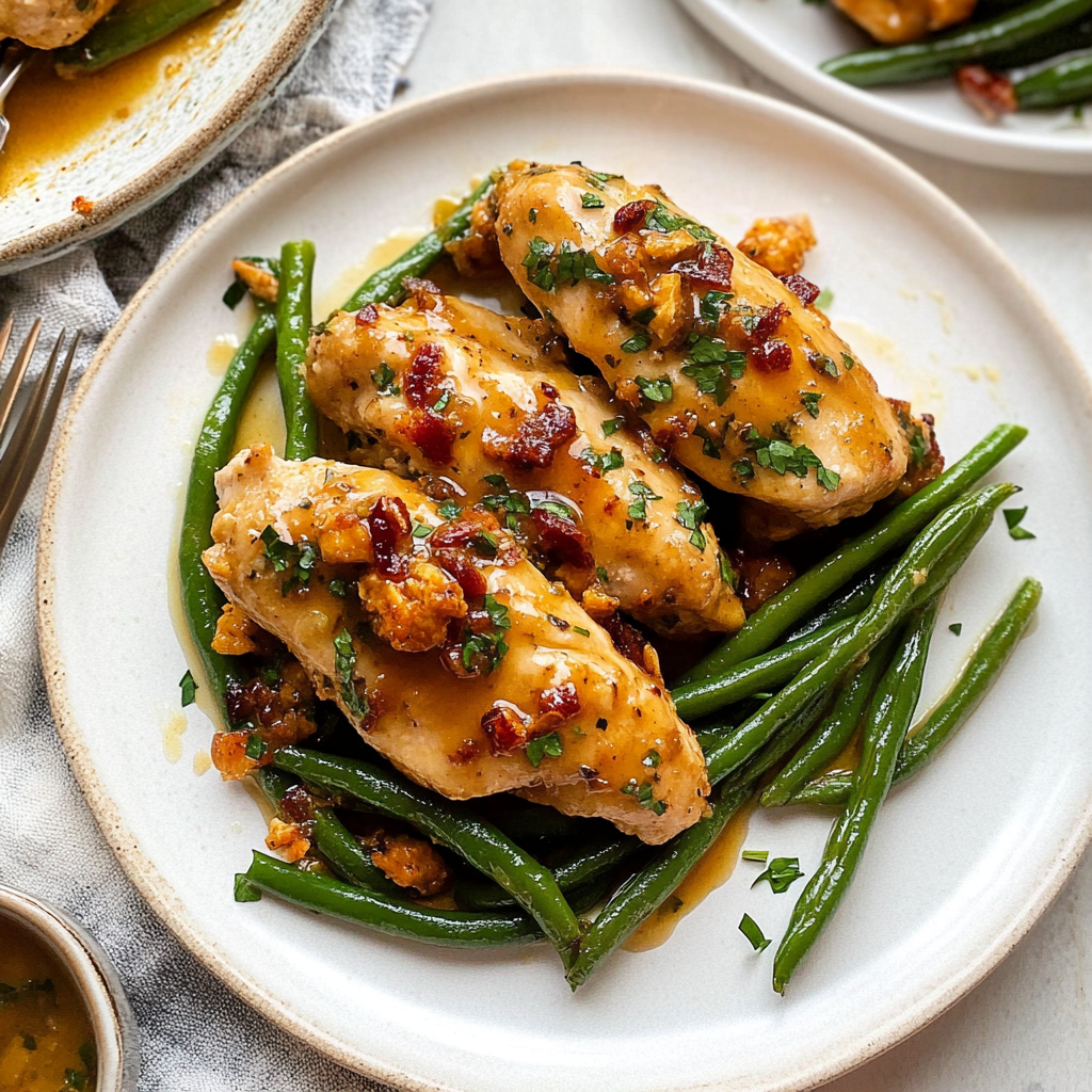 - 6. Finish with remaining butter before serving; drizzle sauce over chicken and green beans.